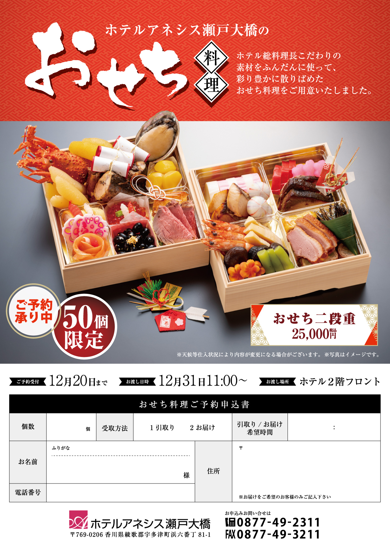 おせち料理のご案内 Posted 2025年11月20日 by webmaster 瀬戸内の素材をふんだんに使って 彩り豊かに散りばめたおせち料理をご用意いたしました。 ご予約期限:2025年12月20日まで お問い合せは ホテルアネシス瀬戸大橋 0877-49-2311まで
