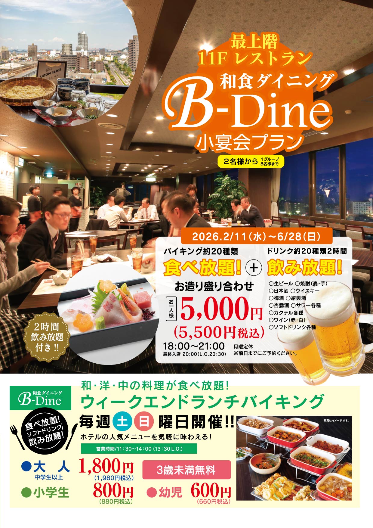 和食ダイニング「B-Dine」からのご案内 Posted 2026年1月22日 by webmaster ホテル11階レストラン「B-Dine」から 小人数のグループの集いにおすすめの「小宴会プラン」 毎週土曜日曜に営業「ウィークエンドランチバイキング」のご案内。 お問い合せは ホテルアネシス瀬戸大橋 0877-49-2311まで